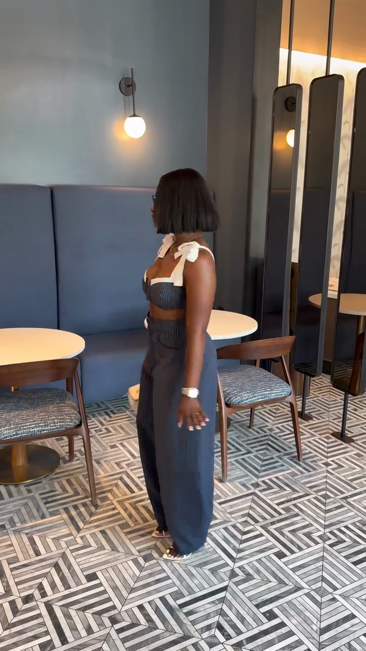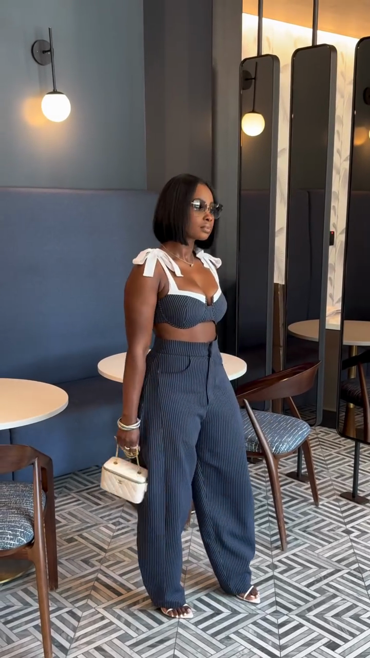 Turn heads with this chic Striped Bow Set, featuring a cropped strap top with bow-detailed accents and matching wide-leg pants. The coordinated design creates a trendy yet effortless look that’s perfect for brunch, parties, or stylish city outings. Crafted from lightweight fabric, it offers both comfort and a flattering fit — your go-to ensemble for standout moments.
